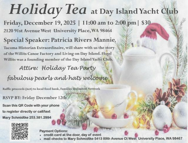 Holiday Tea Party fabulous pearls and hats welcome at Day Island Yacht Club. Tacoma Historian Extraordinaire, Patricia Rivers Mannie, will share with us the story of the Willits Canoe Factory and Living on Day Island. RSVP by December 12th. See Flyer for details.